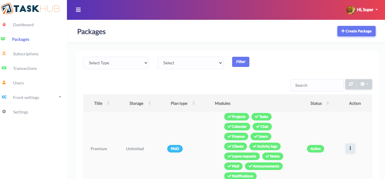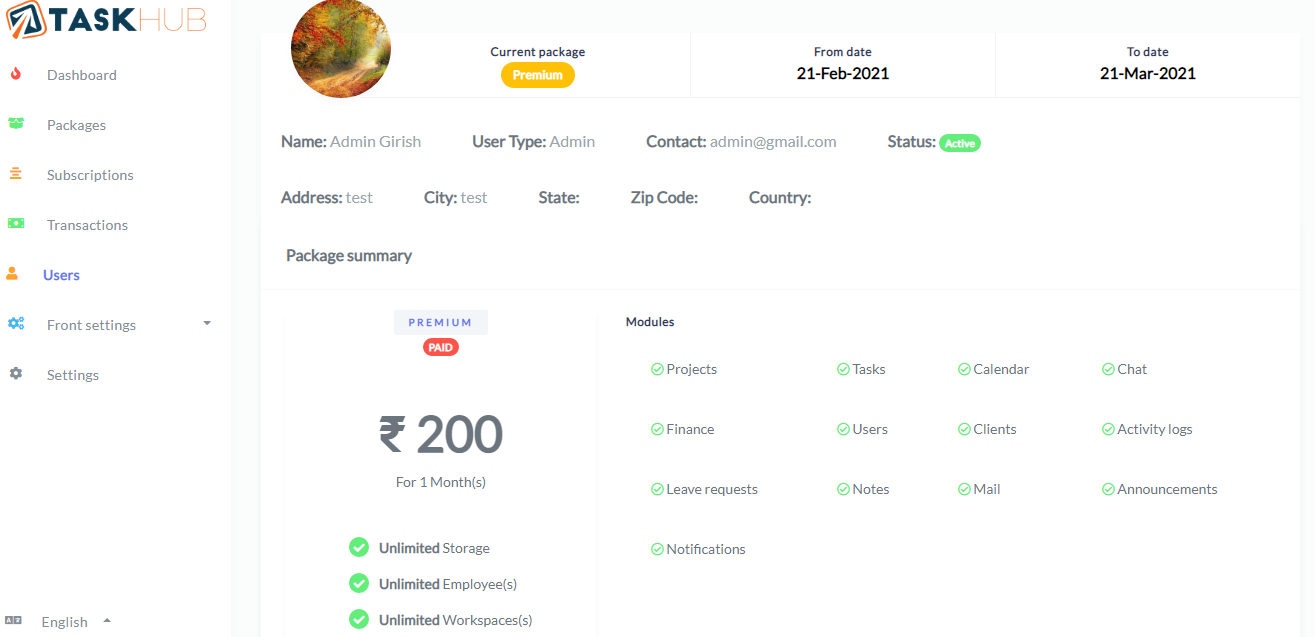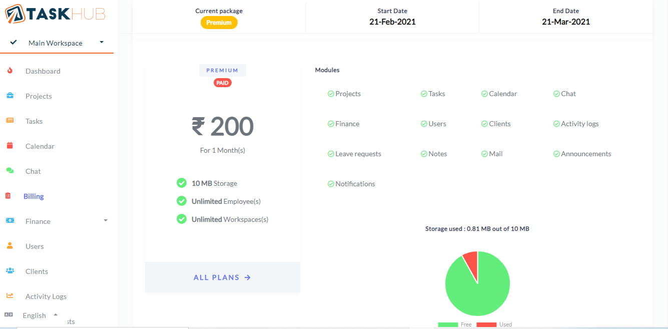 Admin can view all the details about active subscription like storage, modules, start and end date, subscription and transaction list.