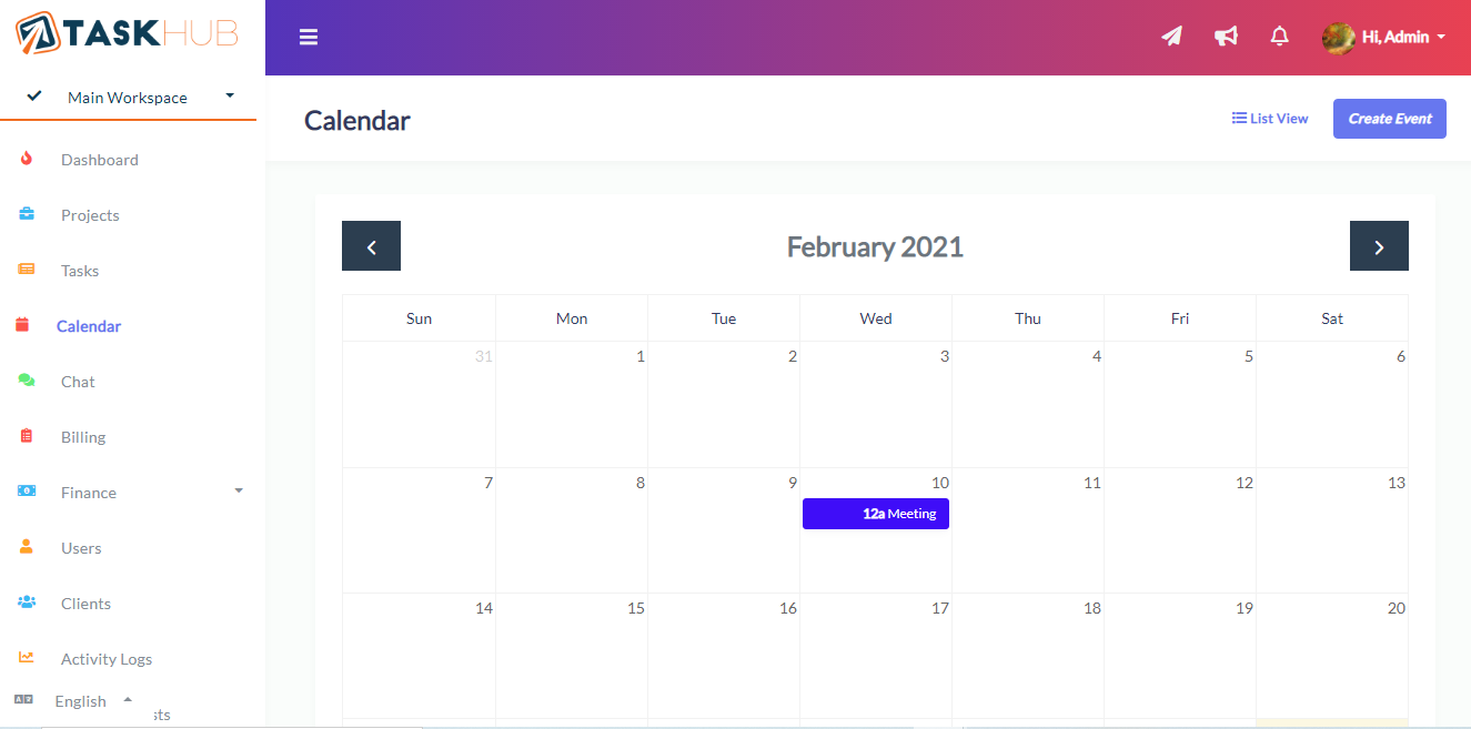 Here workspace users can see notifications like new project or task assigned, new events or announcements created.
