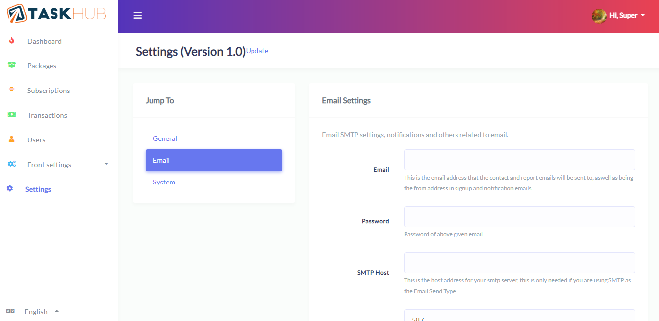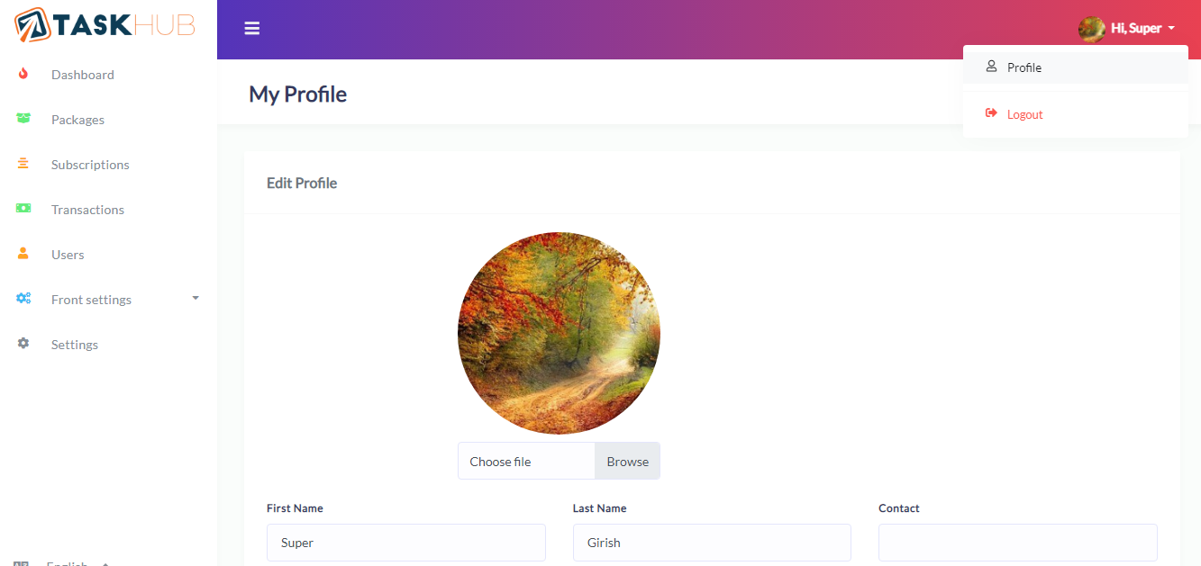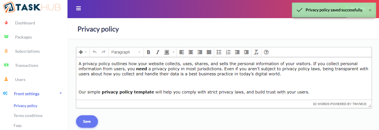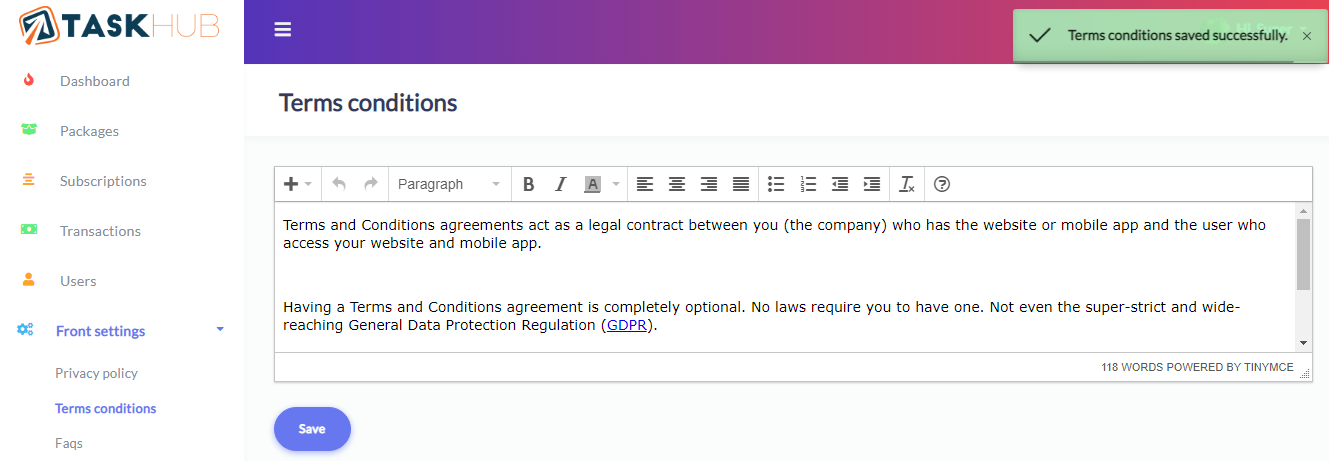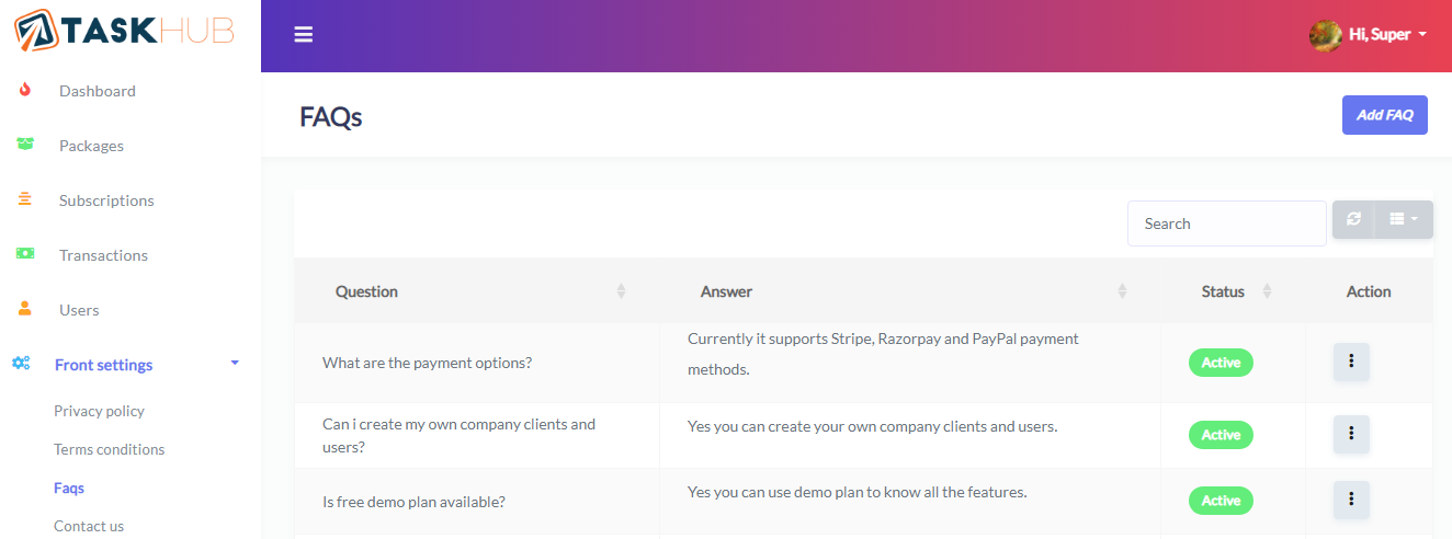 Super admin can manage front panel settings like privacy policy, terms and conditions, Faqs, Contact us, Payment methods