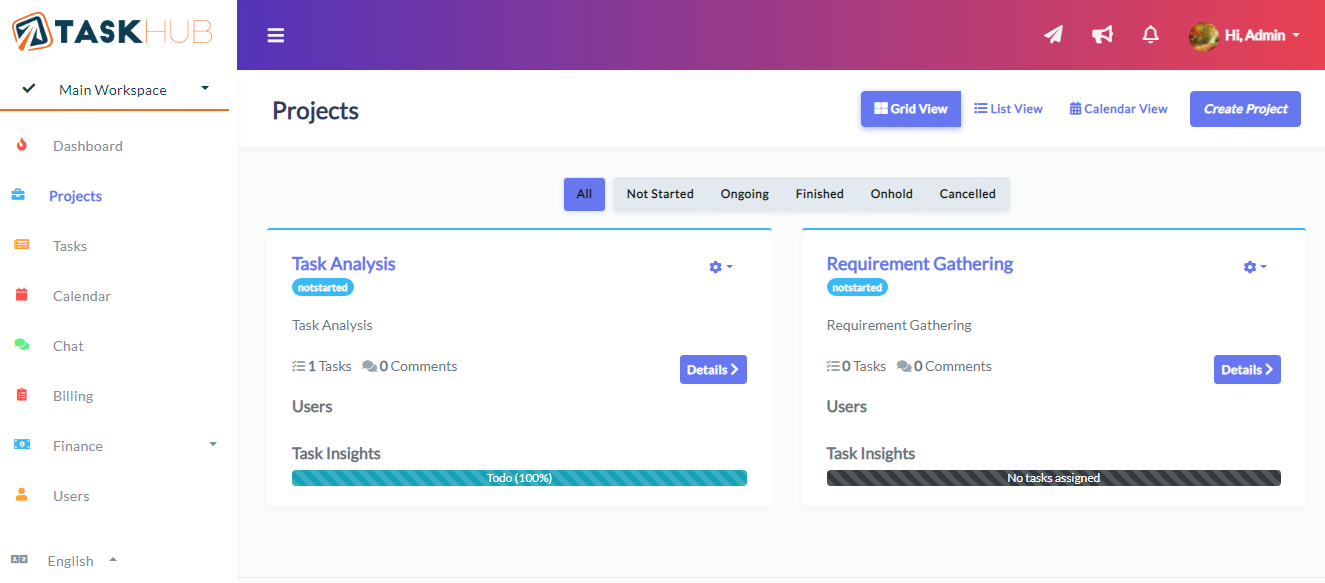 All the project will be listed here. You can create, update and delete project from here. there are 3 types of views are available for projects 1. Grid 2. List and 3. Calendar view.